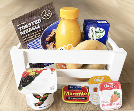 Choose your favourite options - orange or apple juice, bagel, vogels bread, toasted muesli, cornflakes or yogurt.